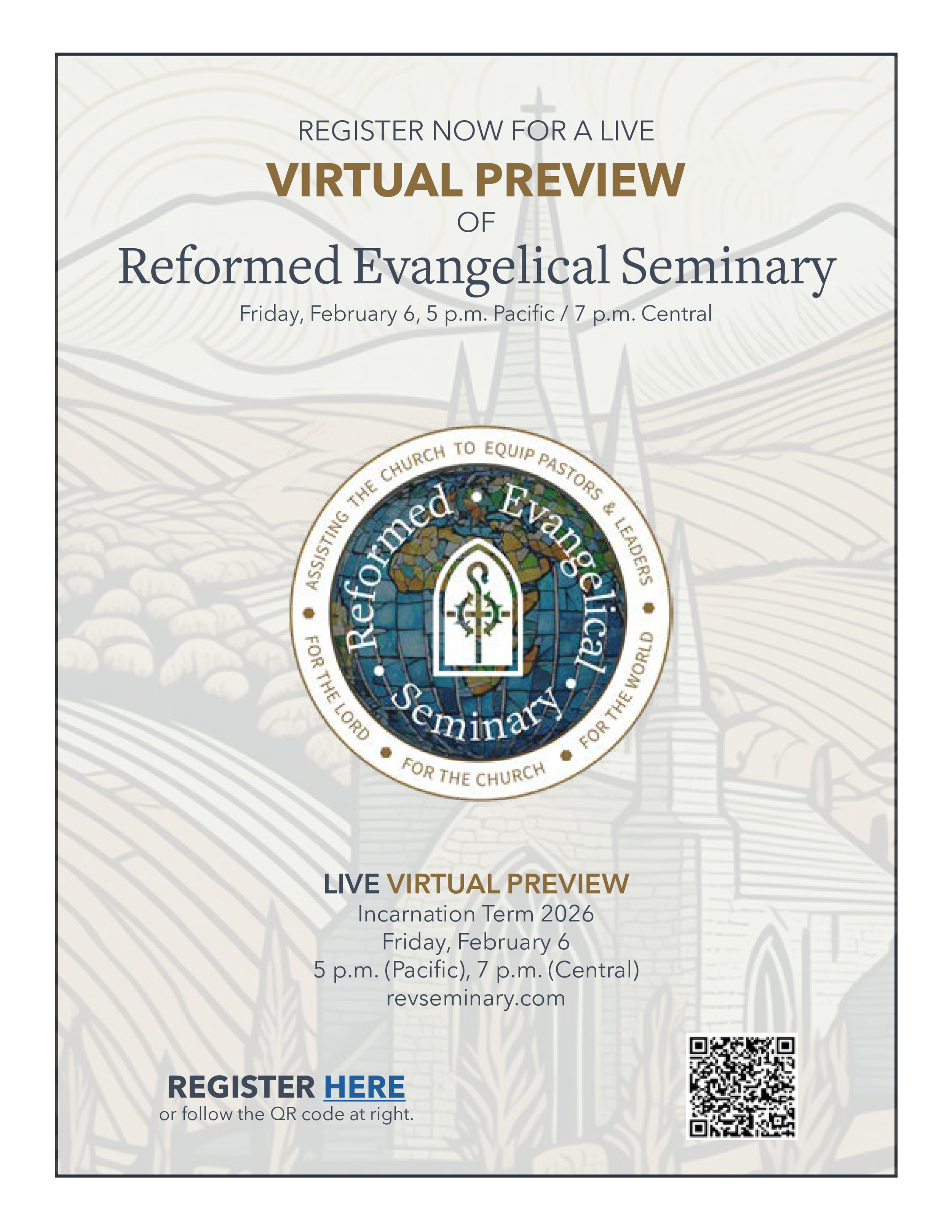 Considering Seminary yourself or encouraging fellow church members to strengthen and deepen their gifts for ministry? Then it will be worth your time to learn more about the programs and courses offered at Reformed Evangelical Seminary. Our next Virtual Preview is set for Feb. 6, at 5 p.m. (PT)/ 7 p.m. (CT). To register for the live preview session, simply click here. We hope to see you there.